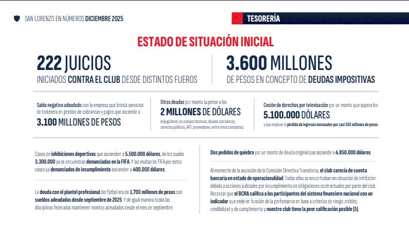 Por último, el material dedicado a informar la actualidad judicial y financiera de San Lorenzo es alarmante: 222 juicios, dos pedidos de quiebra por una deuda que asciende a 4.850.000 de dólares. Además, se aclaran las complicaciones con el plantel profesional y los deportes federados. En este último, varios deportistas se han ido del club por el maltrato de los dirigentes y coordinadores.