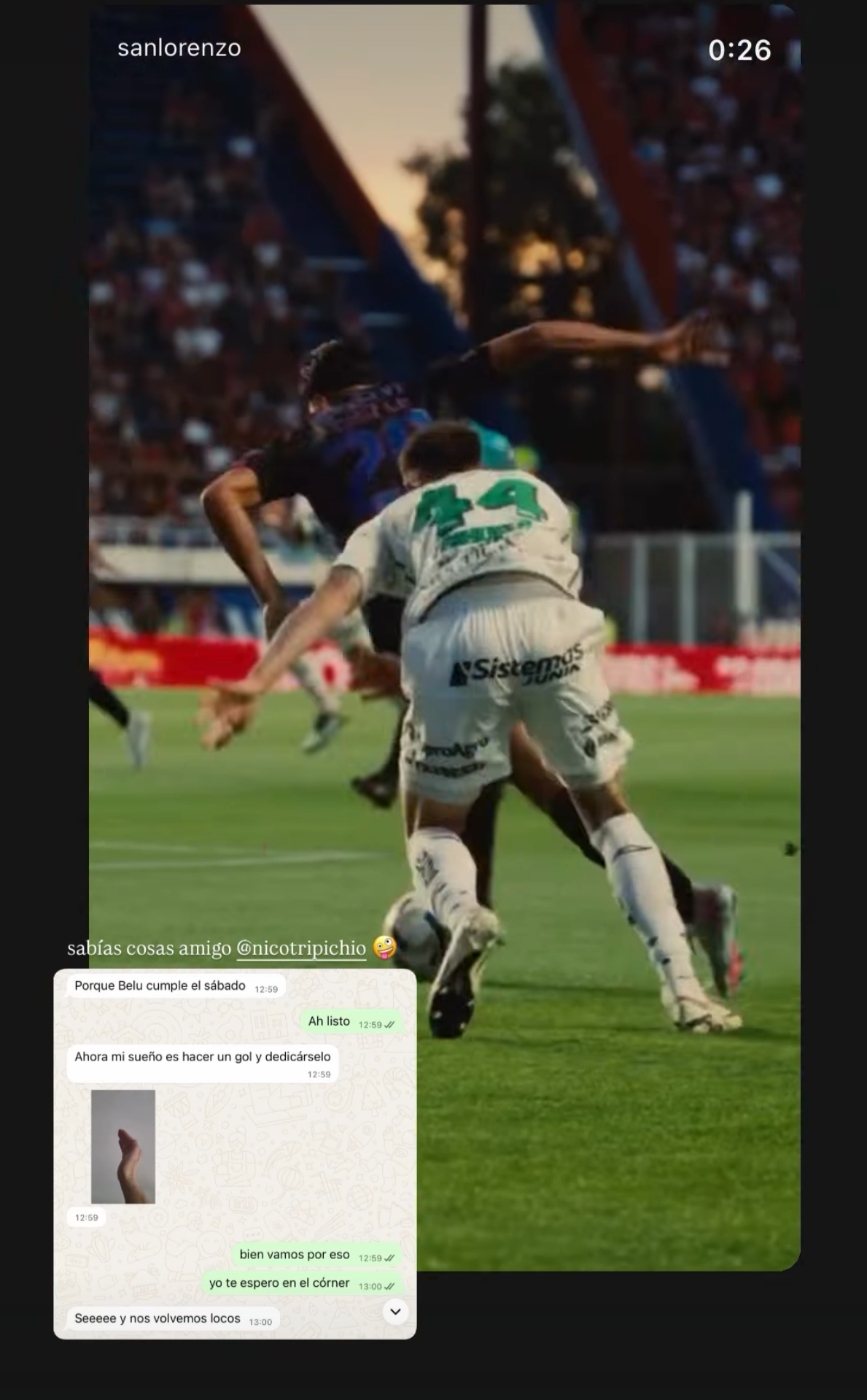 Todo esto quedó demostrado en una de los posteos que subió Gianluca Giustra, quien habitualmente genera contenido audiovisual para las redes y página web de San Lorenzo. Resulta que días antes al cruce ante el equipo de Sava, Tripi le había dicho que quería dedicarle un gol a Belu( su esposa) y es por eso que en el diálogo, le dieron las coordenadas al futbolista para que se dirija al córner a festejar si esto se cumplía.